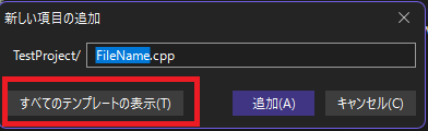 そうすると図のような画面が表示されます。この状態でも「追加」を押せばソースファイルの作成は可能ですが、今回は「すべてのテンプレートを表示」を押してみます。